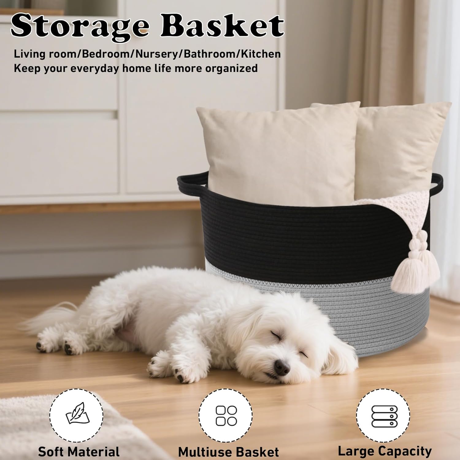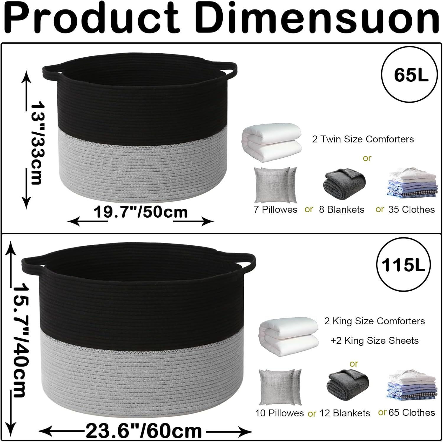 Large Blanket Basket for Organizing,115L Closet Organizers and Storage Bins Box for Shelves Woven Rope Storage Baskets,Living Room,Bedroom,Dorm,Laundry room (Black&Light Grey)