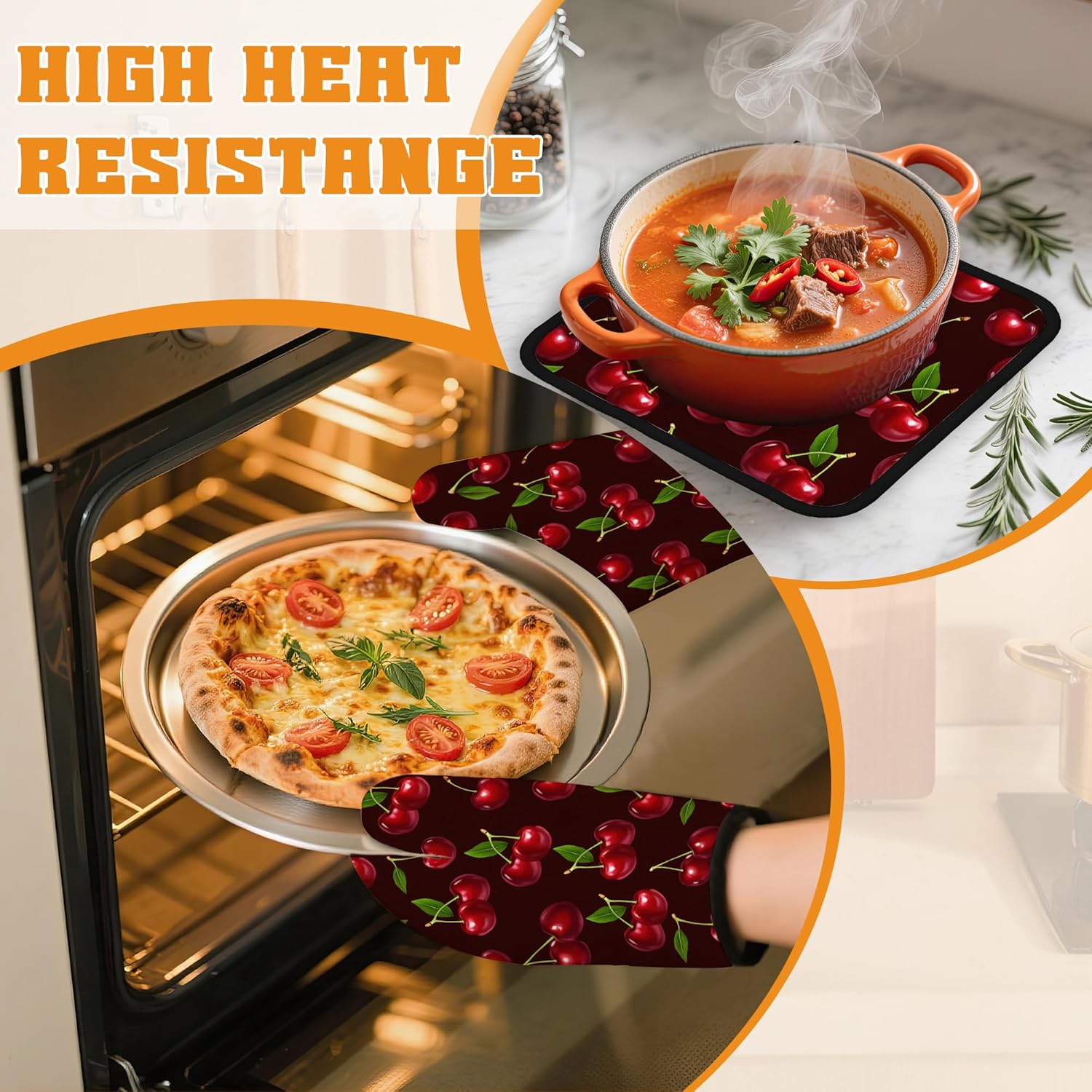 Cherry Oven Mitts and Pot Holders Set,Red Kitchen Decor Heat Resistant Non Slip Hot Pads and Oven Mitt for Chef Cooking Baking BBQ Mom Girl Gifts(4 Piece Set)