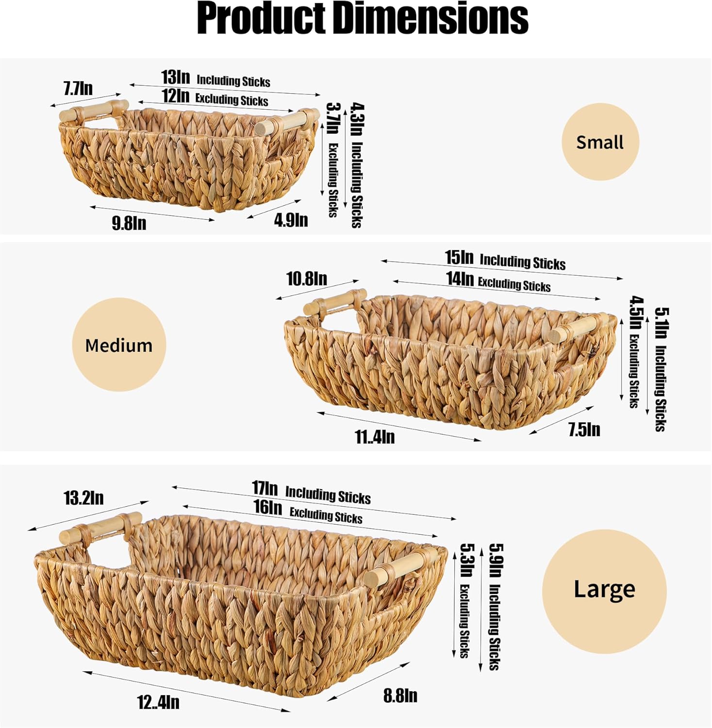 Woven Storage Baskets – Set of 3 Handwoven Water Hyacinth Wicker Baskets with Wooden Handles for Organizing, Decorative Baskets for Laundry Room, Home Decor - Large, Medium & Small