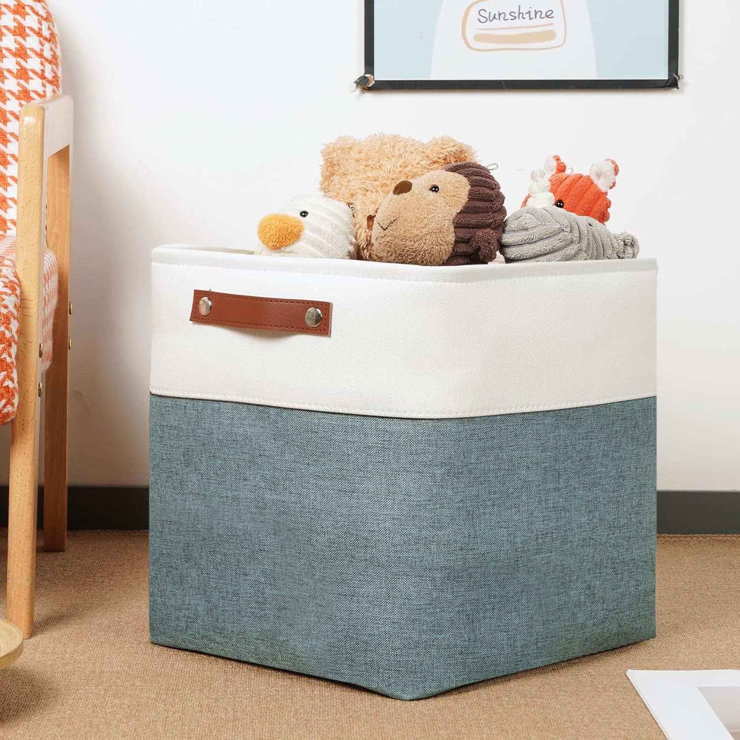 DULLEMELO Set Of 4 Cube Storage Bins, Fabric Storage Basket for Shelves Closet Nursery Toy Storage, 12 inch Fabric Storage Cubes Bins Canvas Organization Baskets (White&Deep Green)