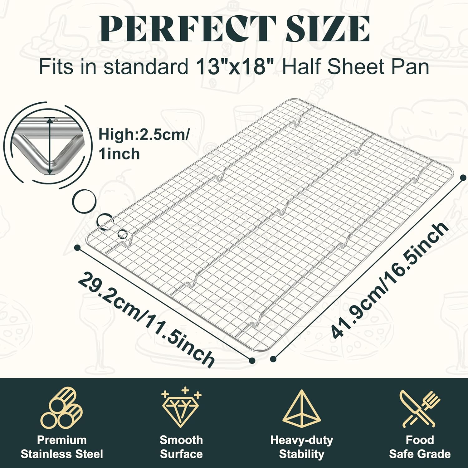 - PERFECT FITS HALF SHEET SIZE: Our cooling racks for baking measures 16.5 x 11.5 x 1.0 inches and is designed to perfectly fit a large 13x18 inch half sheet baking pan (baking pan not included). The 9 higher 1 in support feet provide better air circulation, making your baking process more efficient, easy, and enjoyable
