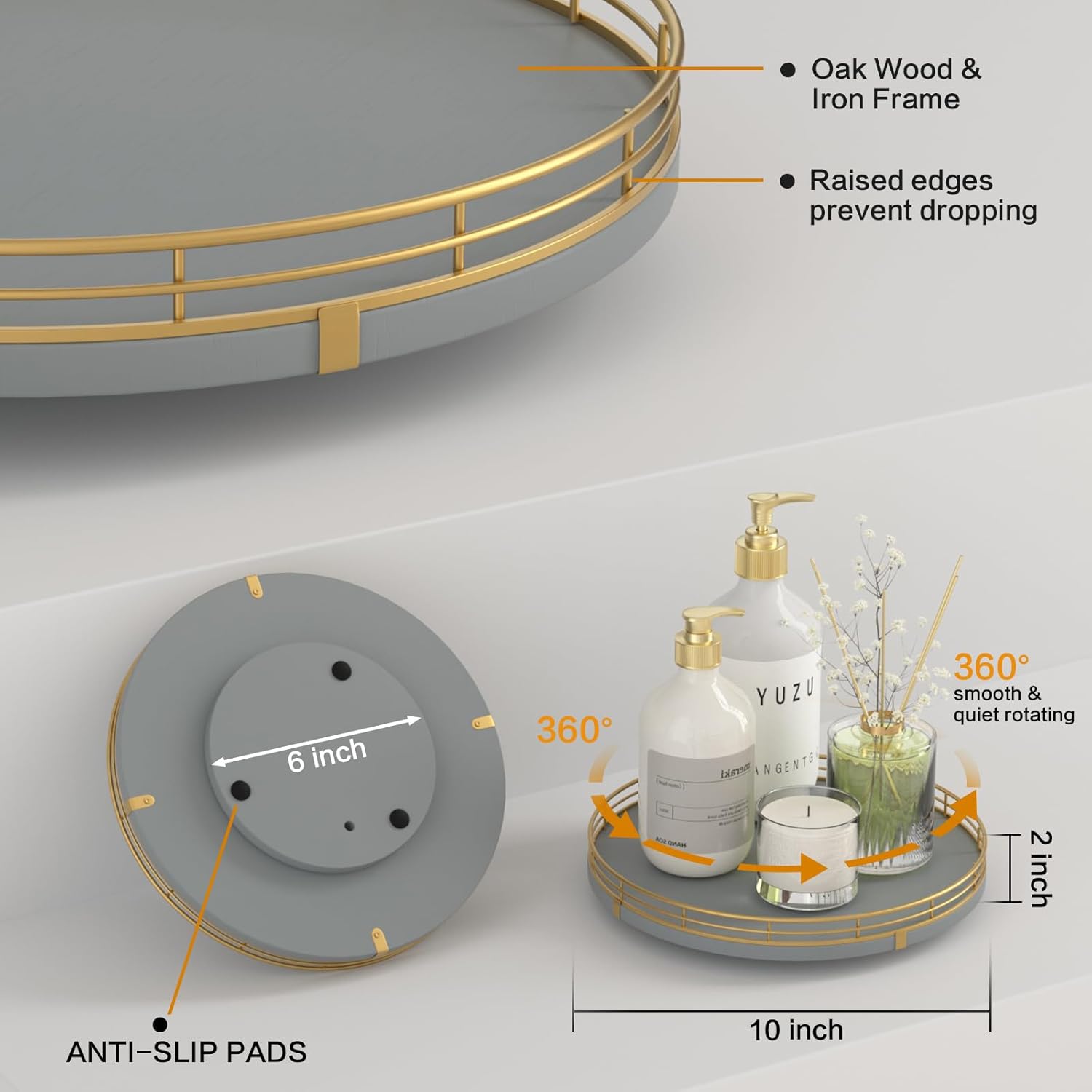- 【Premium Oak Wood with Gold Metal Frame】Crafted from durable oak wood and a stylish iron-gold frame, this wooden lazy susan turntable adds both elegance and functionality to your home. Ideal as a wooden lazy susan for table top or a countertop lazy susan for kitchen decor.