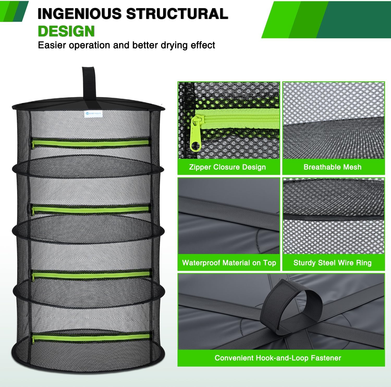 - AVAILABLE IN VARIOUS SIZES: The herb dryer hanging rack is available in 4-layer, 6-layer, 8-layer and 3 colors. This plant drying rack is 4-layer, 23.6" in diameter, each grid is 7.5" high, and 30" in total height when unfolded, fits 2x2 or Larger Grow Tents. The multi-layer separated drying net ensures optimal airflow between the trays, thereby achieving faster and more even drying. It provides ample space for flower buds and food to meet all your drying needs. Due to the elasticity of the mesh, slight size variations may occur