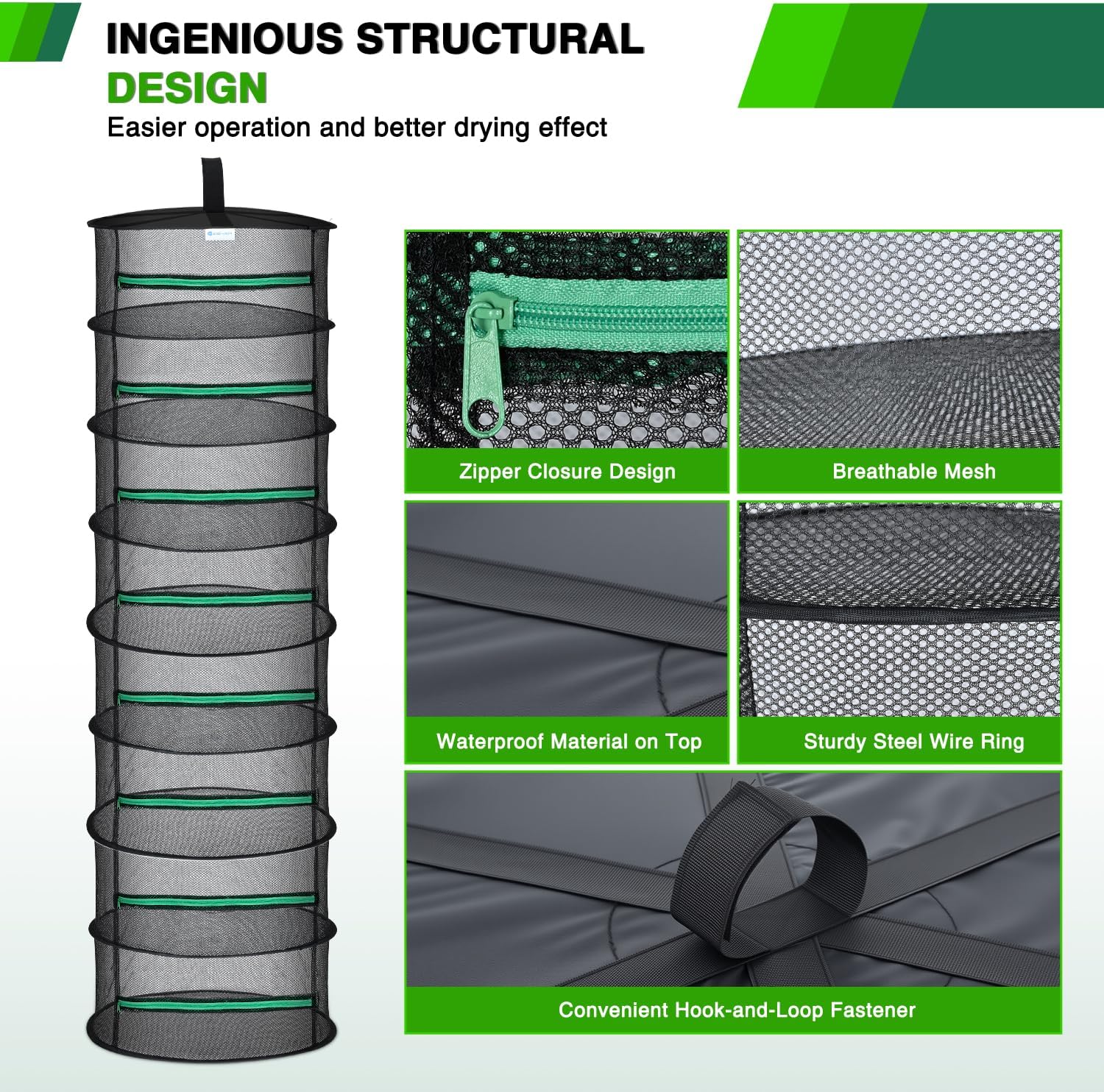 - EASY TO STORE AND ZIPPER DESIGN: The foldable mesh drying racks is easy to carry and store. Each layer features a green zipper closure that opens and closes easily and slides smoothly, effectively protecting herbs from wind, birds, and dust. You can place this cannabis drying rack anywhere, such as outdoors, on a balcony, in a grow tent, in a garage, or in a closet. (OPEN WARNING: Be careful when you open the package, those nets will POP OUT)